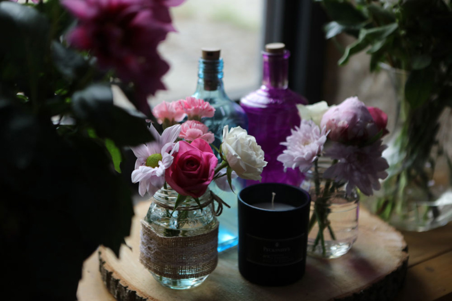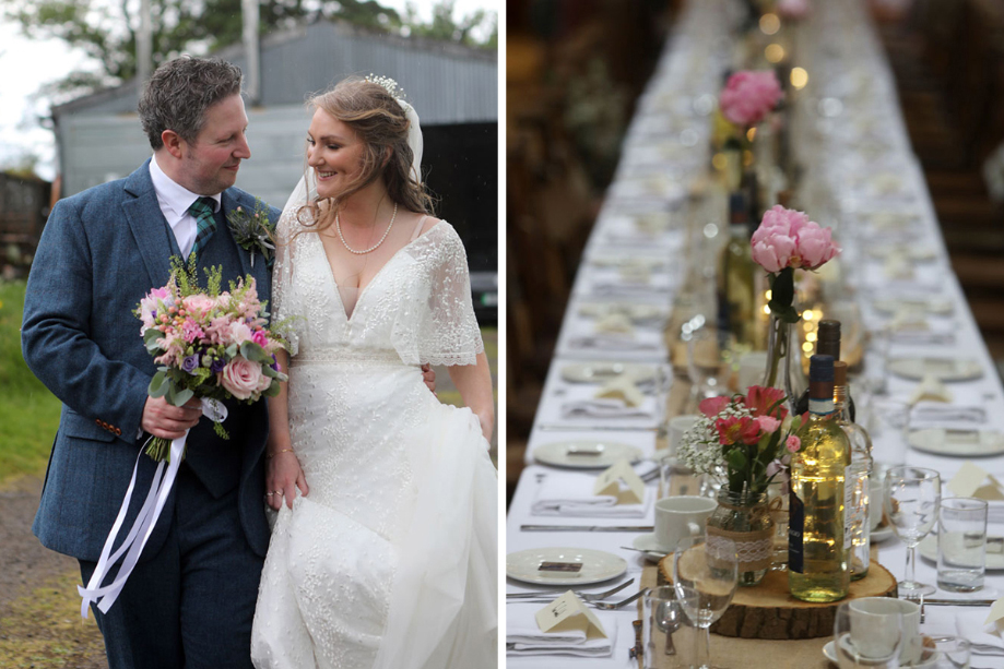 We undertook almost all of the venue decorating ourselves in a rustic, laid-back style. Cormiston Farm provided tables, chairs and table linen and our wonderful florist Juniper Flowers created the bouquets and top table centrepiece – but we did the rest.