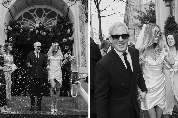 Jamie Laing and Sophie Habboo walk out of Chelsea registry office to confetti from family and friends. (Photos: Sophie Habboo on Instagram @sophiehabboo)