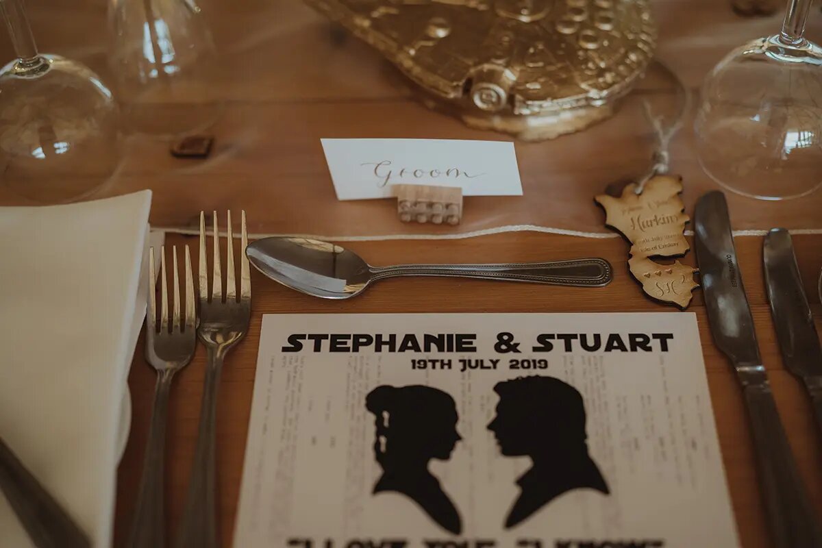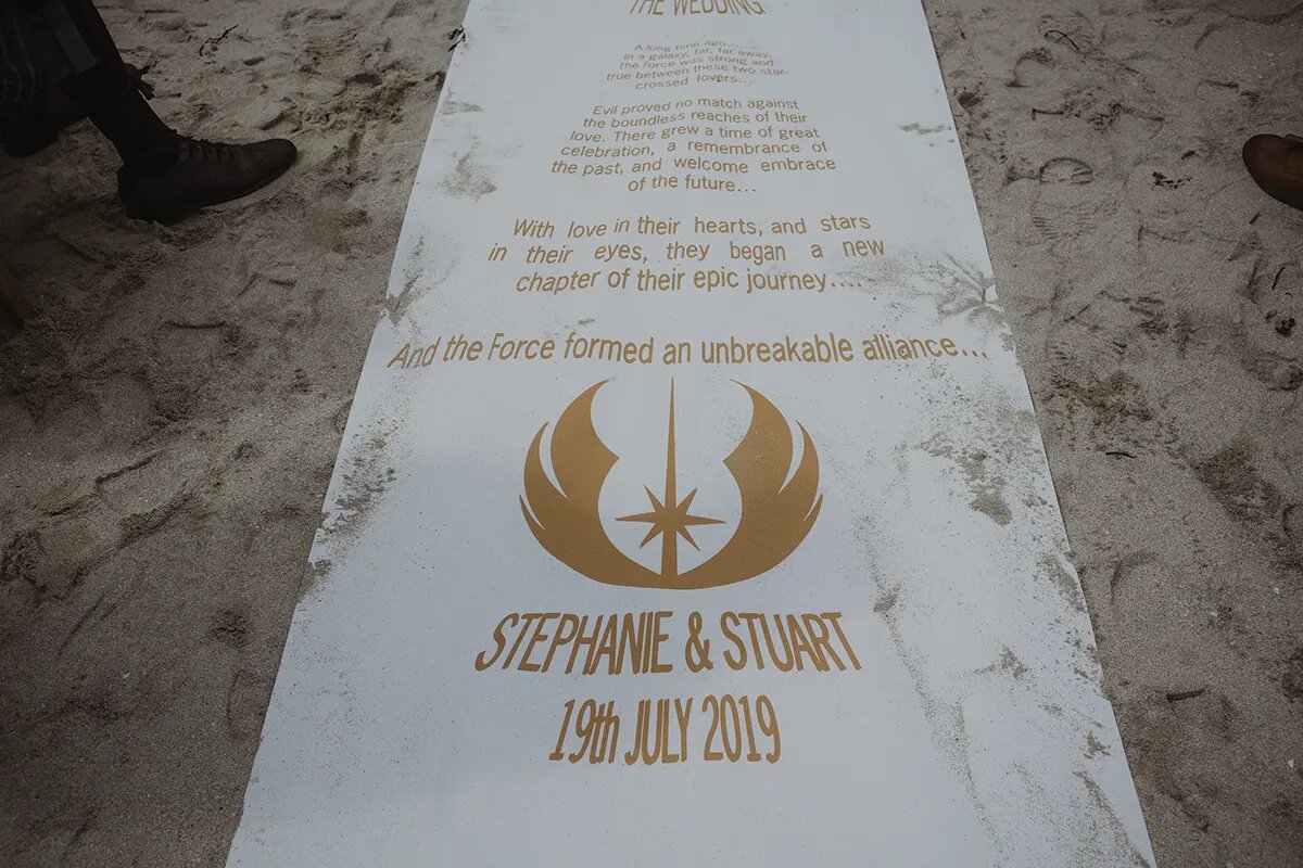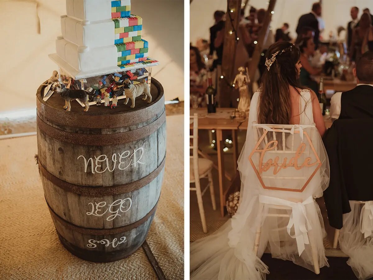 We wanted a relaxed party atmosphere, with personality thrown in. Our wedding was heavily influenced by my other loves, Star Wars and Lego. I handmade my headpiece and lightsaber bouquet from scratch, designed the Lego cake and stand, and even came up with our beach ‘altar’: a customised whisky barrel in homage to the island’s most famous story, Whisky Galore. I also created our centrepieces, table decorations, favours, seating plan and table names.