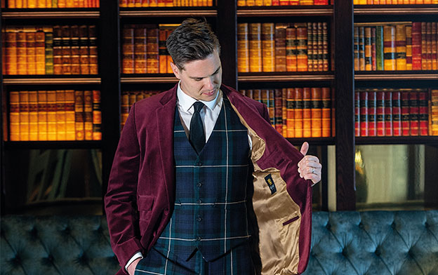 Left: Dean and the team are on hand to help customers from across the globe, fancy finding out what your clan tartan is? Right: At our fashion shoot at Killochan Castle last year, our model looked dashing in a ScotlandShop suit (Photo: David N. Anderson)