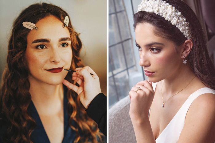 Left: Get that bridal glow by starting skin prep early, says Anne Marie at AMM Hair and Makeup Team Photo: (Del and JayJay Wedding Photography), Right: Bridal hair and makeup by AMM Team (Photo: Hamish Campbell)