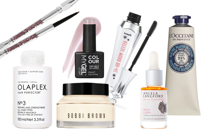 Benefit Precisely, My Brow Pencil, £24.50,Olaplex Hair Perfector No.3, £28, Mylee XOXO Gel Polish, £8.99, Bobbi Brown Vitamin-Enriched Face Base, £52, Benefit 24-Hour Brow Setter, £24.50, Angela Langford Bloom & Glow Oil, £20.50, L’Occitane Shea Butter Intensive Hand Balm, £26.50