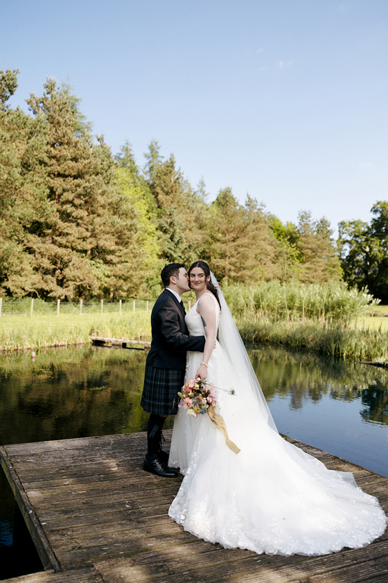 Outside, couples can exchange vows beside the venue’s large natural pond, often home to ducks and moorhens, or in the gardens surrounded by mature trees and rustic stone buildings. Informal lawn games and outdoor dancing are popular in the summer months.