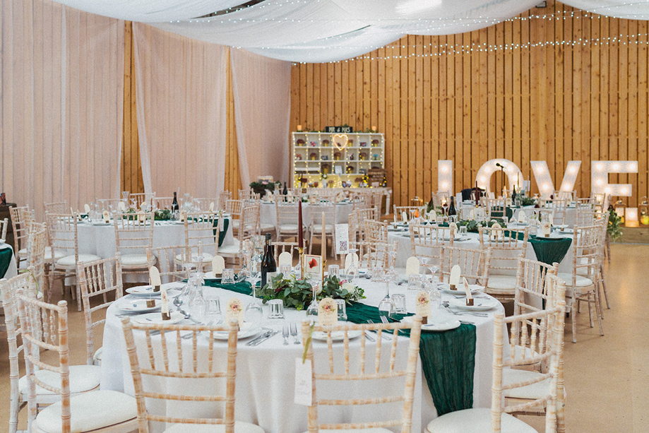 • Main barn – seats up to 120 for dining and offers ample space for evening celebrations, featuring a suspended wooden floor ideal for dancing.